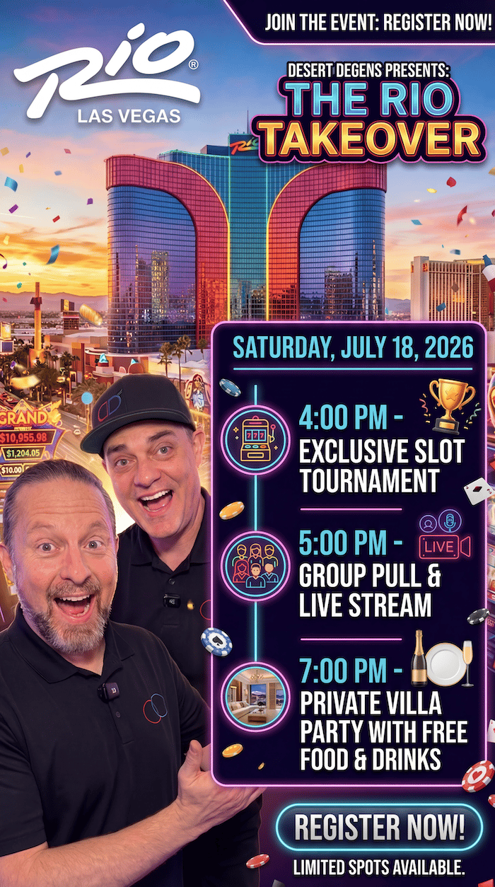 Join us July 18th at Rio in Las Vegas, Nevada. The festivities kick off at 4:00pm, with an exclusive slot tournament just for Desert Degens fans. We will be kicking off a live stream at 5:00pm and doing the biggest group pull in Desert Degens history. At 7:00pm we will head to our private villa where you can enjoy free food and drinks with the Degen's until 10pm. Registration is free, but you must be registered in advance to attend the event. Please only register for the event if you are sure you can be there.